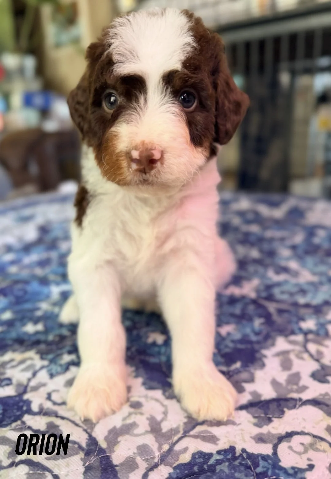 Orion is a truly eye-catching brown phantom parti with a curly coat and some of the most unique facial markings we’ve seen. His expression alone stops people in their tracks—there’s something thoughtful and soulful about the way he observes the world. Temperament-wise, Orion is smart, calm, and collected. He approaches new experiences with a steady, composed mindset and shows excellent emotional regulation for his age. His intelligence, paired with his calm nature, makes him an excellent candidate for a variety of lifestyles, from relaxed households to those looking for a focused, thoughtful companion. Orion will attend our puppy primer school, giving him a solid foundation for being the best gentleman as he matures.