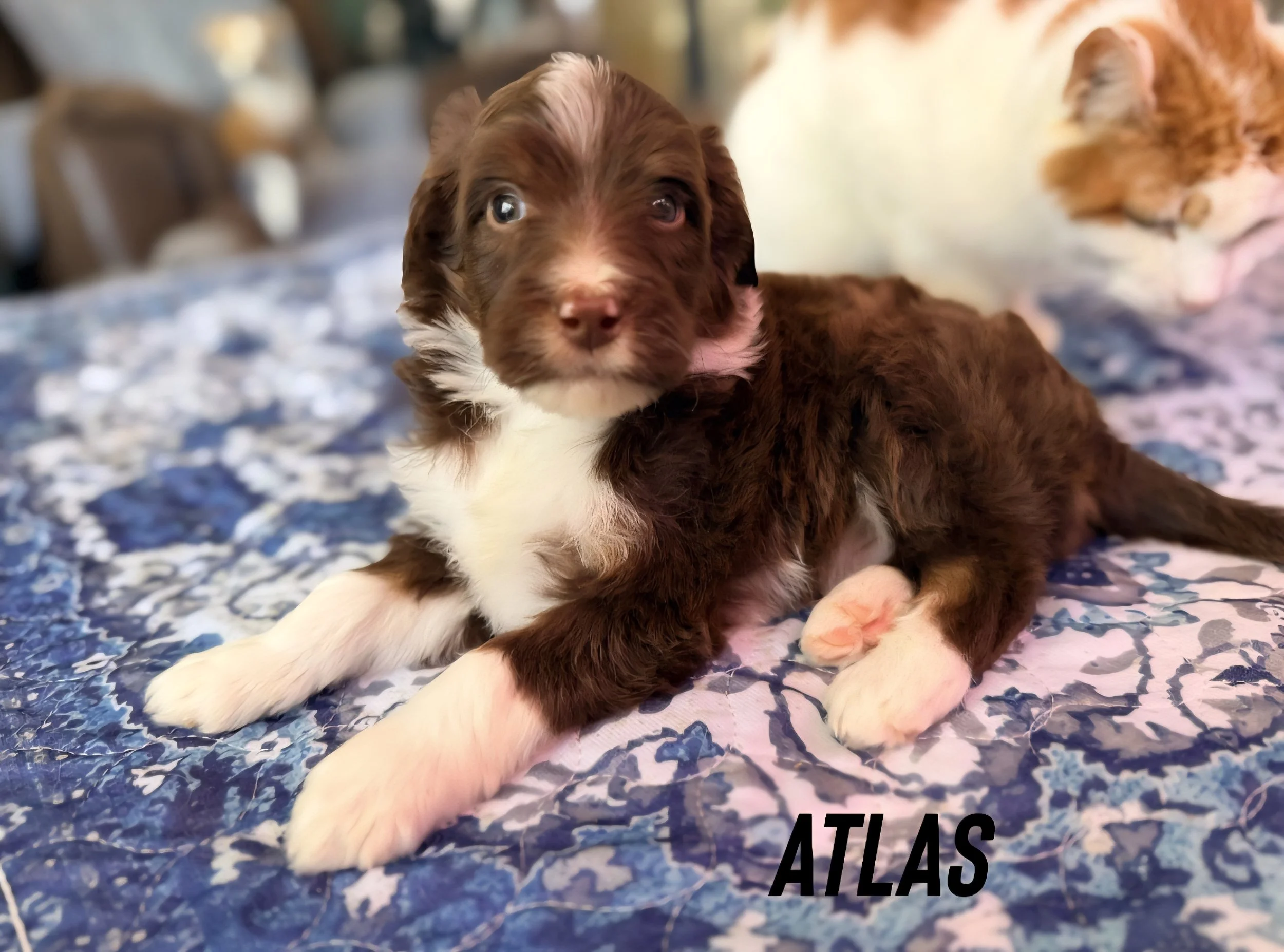 Atlas is a striking brown tri-color Bernedoodle with a gorgeous wavy coat and a confident, engaging presence. He carries himself with quiet self-assurance and genuinely enjoys interaction, making him a joy to spend time with whether he’s exploring his surroundings or checking in with his people. Genetically, Atlas has one copy of the curl gene and is furnished, which means he’s expected to have minimal to no shedding—a great balance of coat beauty and manageability. We anticipate that Atlas will have moderate energy needs, which we rank at 5.5/10. He enjoys activity and engagement but also knows how to settle, making him a wonderful fit for a home looking for a companion who can keep up without being overwhelming. Atlas will attend our puppy primer school, giving him a solid foundation for being the best gentleman as he matures.