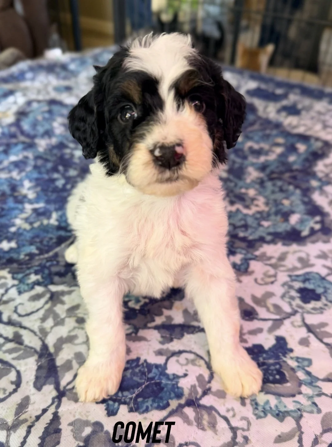 Comet is a traditional tri-color parti with a gorgeous wavy coat and a personality that truly shines. He has a lively presence and a spark about him that makes him instantly engaging, without tipping into over-the-top energy. He is furnished and will be unlikely to experience shedding. His wavy texture adds to his charm and gives him an effortlessly handsome appearance. Temperament-wise, Comet is attentive and watchful. He’s very aware of his surroundings and tuned in to his people, often observing before jumping in. This thoughtful attentiveness makes him especially responsive and a great candidate for continued training and structured engagement. Comet is a wonderful choice for a family looking for a puppy with personality, presence, and an intelligent, observant nature. Comet will attend our puppy primer school, giving him a solid foundation for being the best gentleman as he matures.